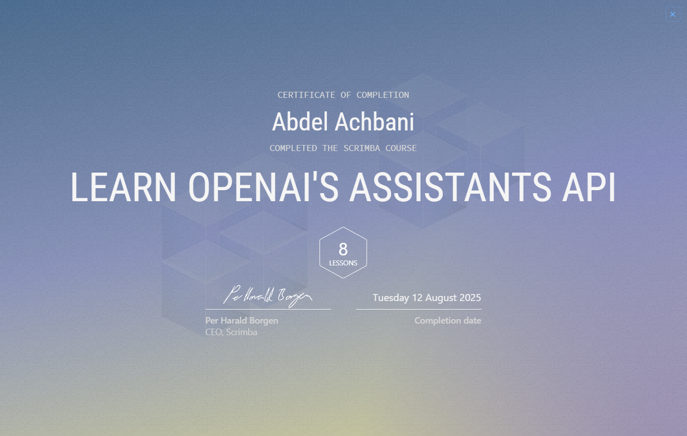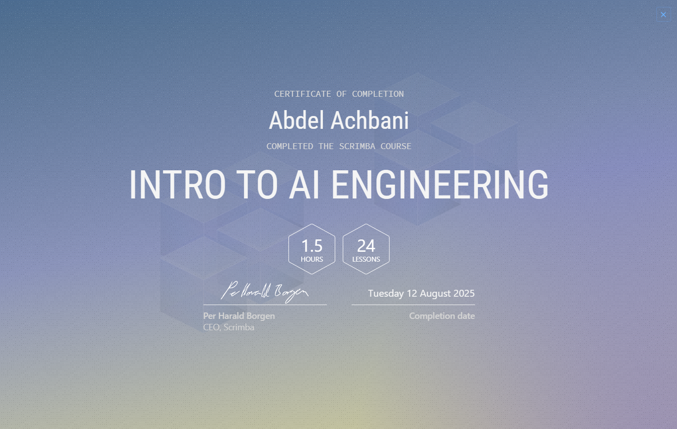 I completed the AI Engineer Path: a practical, JavaScript-powered track where I built generative-AI apps and learned OpenAI, Hugging Face, embeddings/vector databases, AI agents, and the Assistants API.