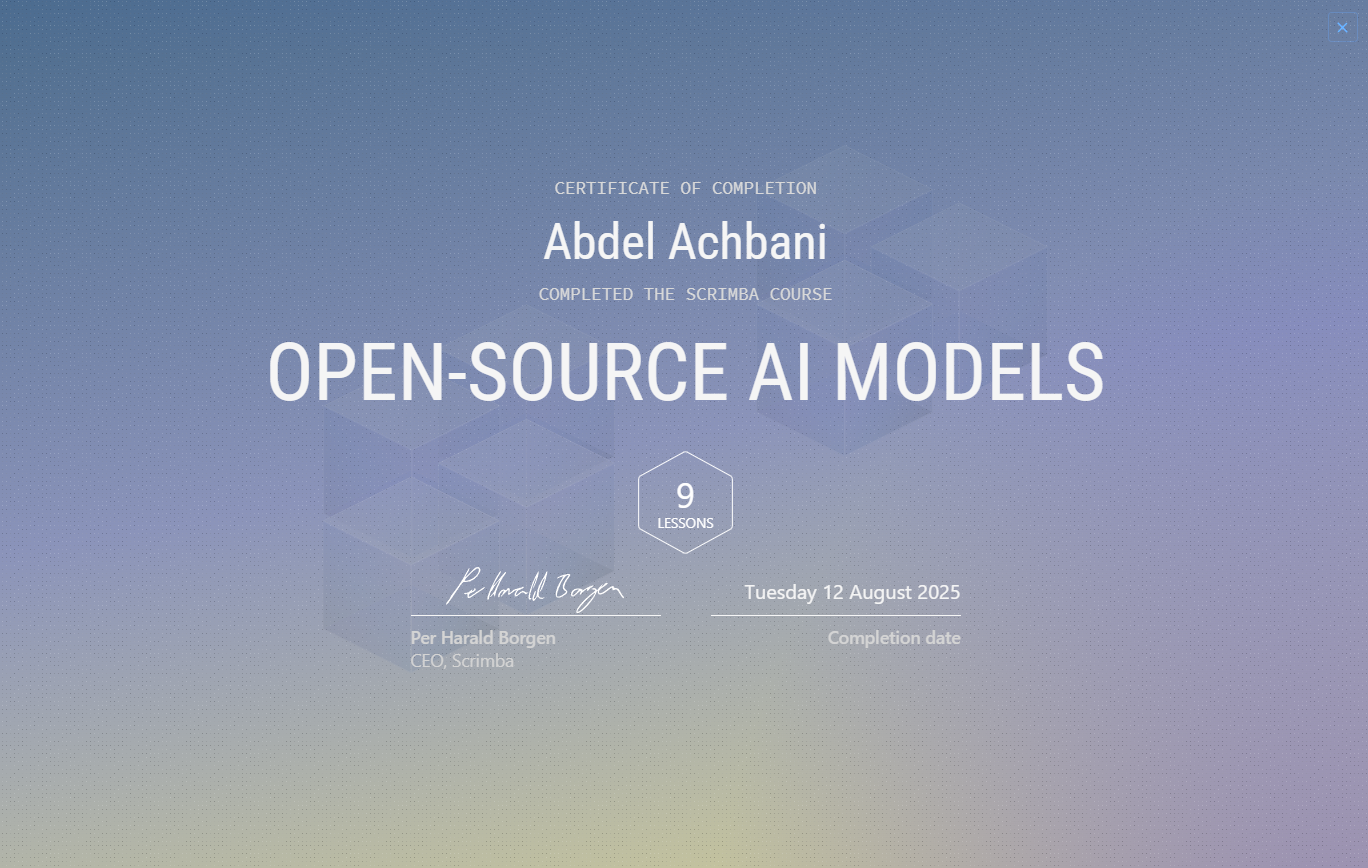 I worked with open-source LLMs using HuggingFace.js and Transformers.js, ran models in the browser and locally with Ollama, implemented text-to-speech and image transforms, and learned to find free models on the Hub.
