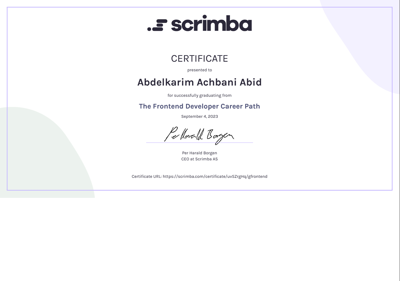 To earn this certificate, I've learned some of the most relevant Frontend Web technologies, starting with HTML, CSS, and JS, and then libraries like React & React Router, and things like making extensions, using Firebase, responsive design...
