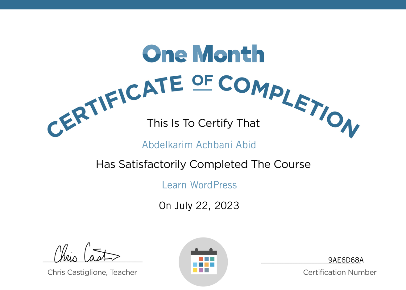 To earn this certificate, I've learned the most important things about WordPress themes development and configuration, and deployment of WordPress-based pages.